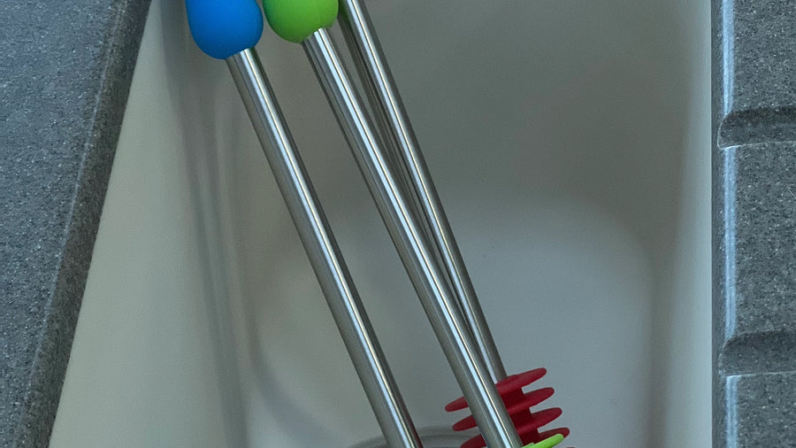 This dishwasher safe silicone brush with stainless steel handle is perfect for quickly, easily, and hygienically cleaning ' stuffable' enrichment toys.