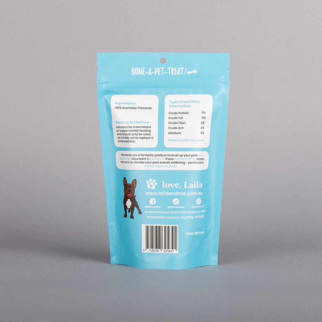 Pilchards are soft-boned fish. Once dehydrated, the bones become brittle and crumble easily, making them digestible and safe when fed appropriately. Always supervise your pet while treating and ensure fresh water is available.