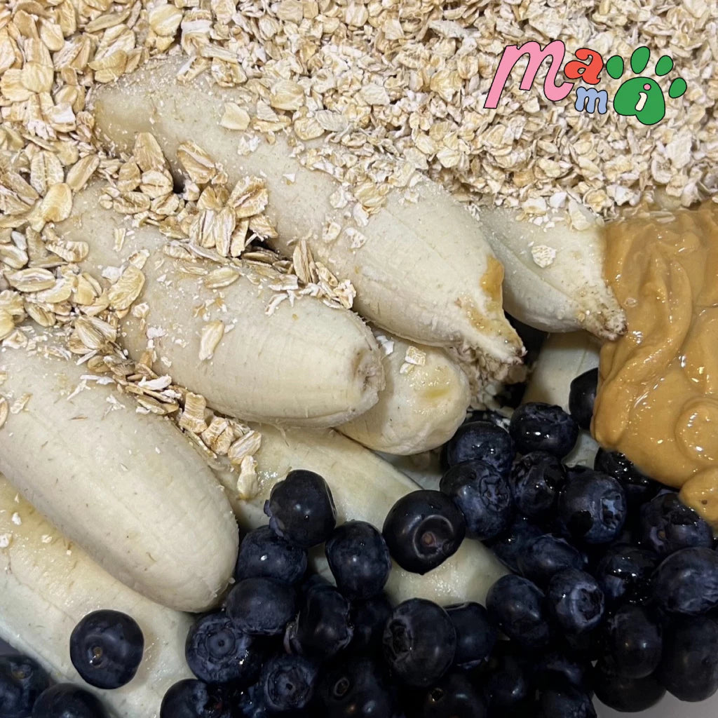Banana, blueberry, oats, organic peanut butter (salt-free, xylitol-free, oil-free)