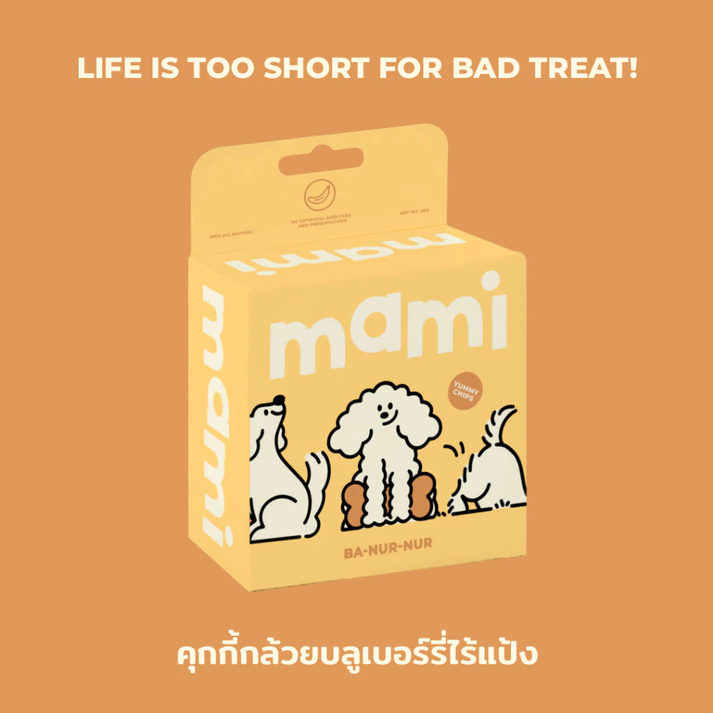 Yummy Chips Ba-Nur-Nur are made from human-grade ingredients, produced in our own factory in Thailand and certified by the Department of Livestock Development. These gently baked cookies combine banana and blueberry to create a naturally tasty treat that also supports healthy digestion.